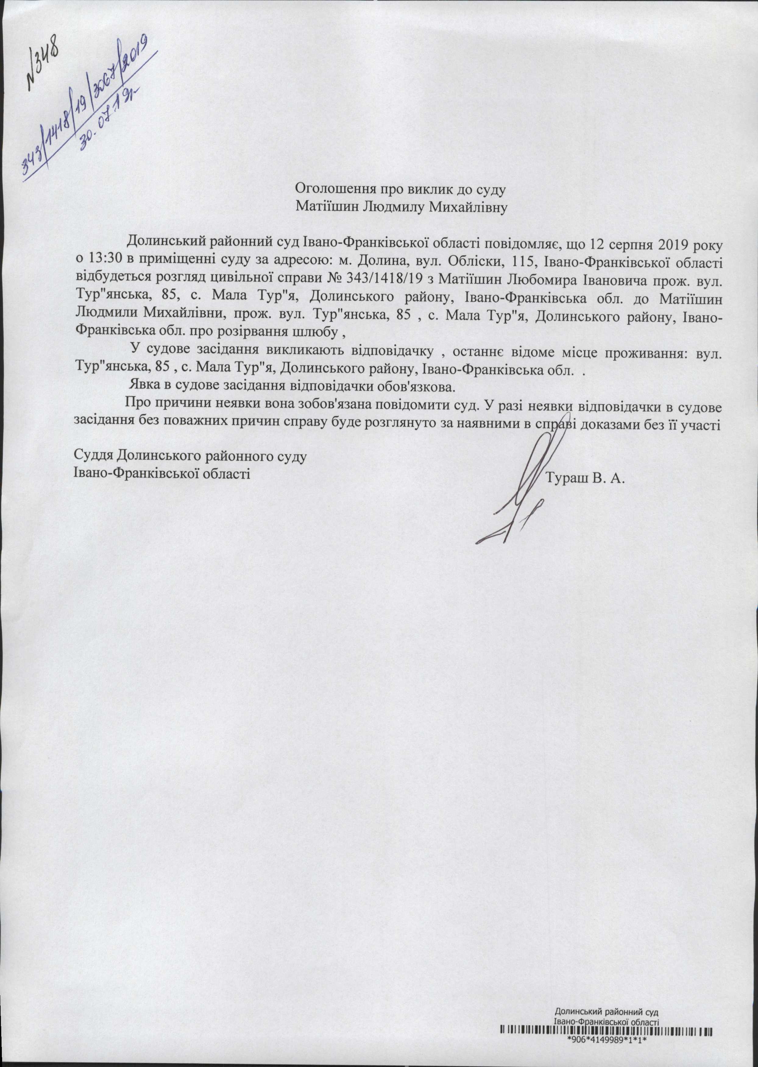 ОГОЛОШЕННЯ ПРО ВИКЛИК до СУДУ Матіїшин Людмилу Михайлівну у цивільній справі № 343/1418/19