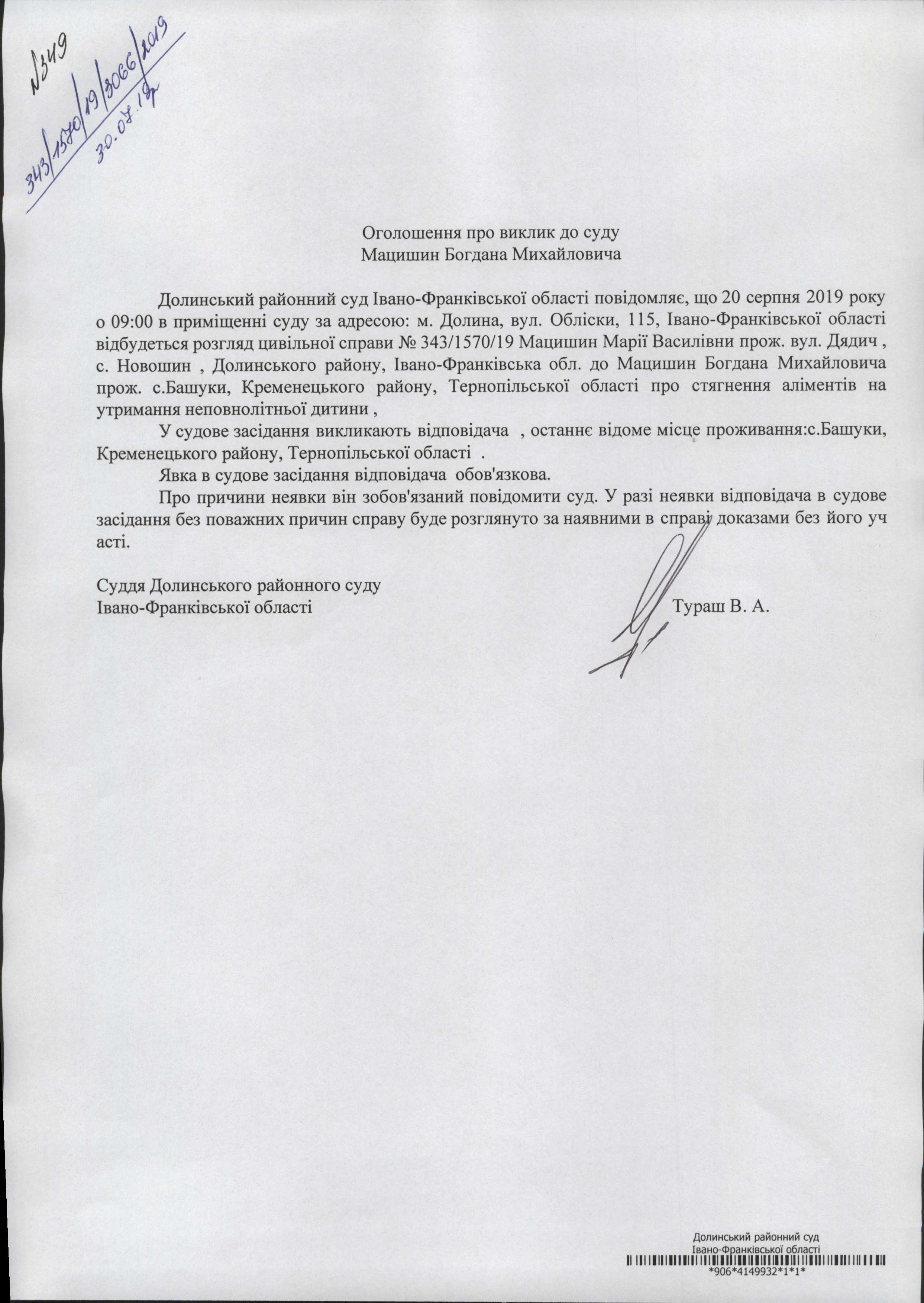 ОГОЛОШЕННЯ ПРО ВИКЛИК до СУДУ Мацишин Богдана Михайловича у цивільній справі № 343/1570/19